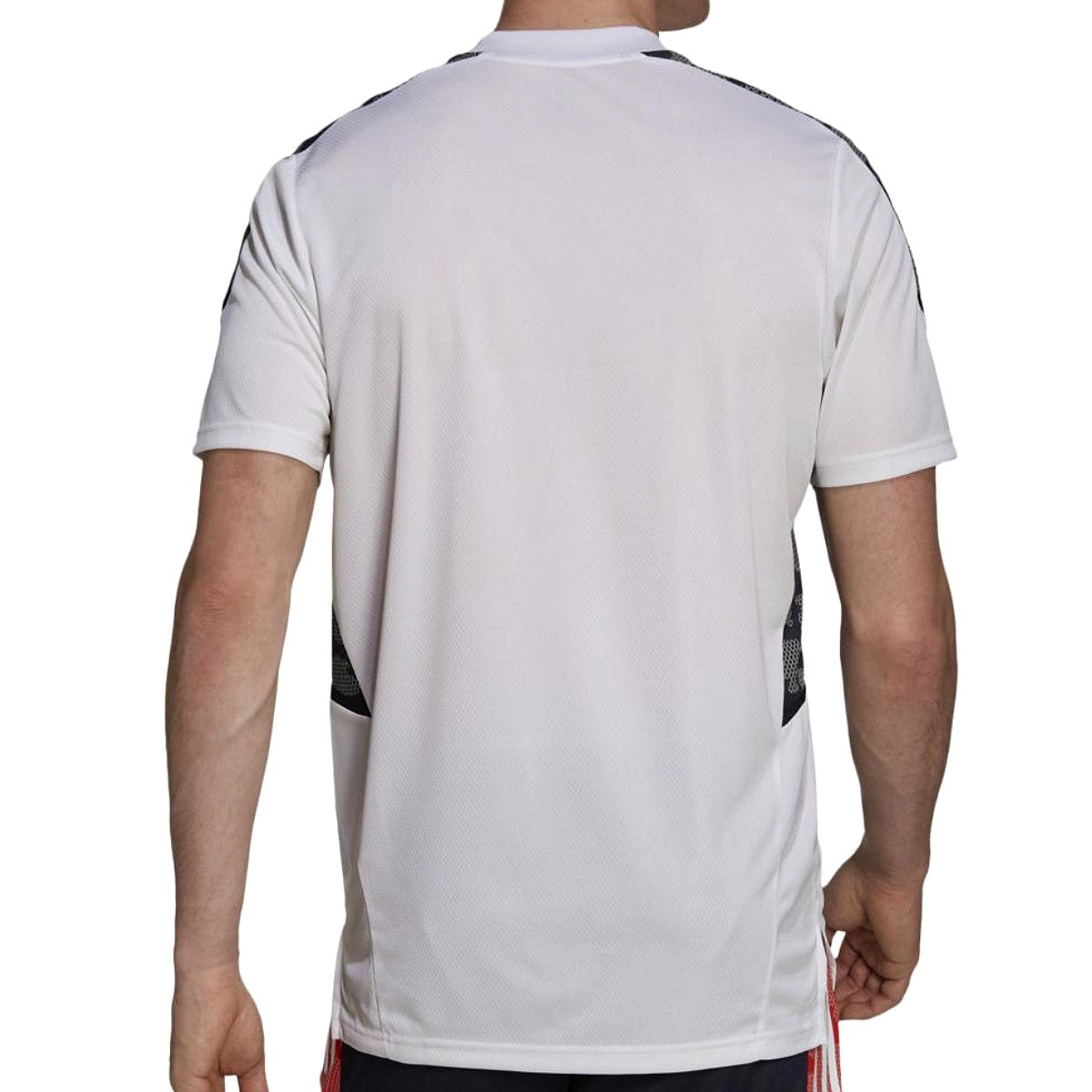Official Bayern Munich training soccer set for UEFA Champions League 2021/2022 season. It features white jersey and matching black shorts, both with red crest and logo. Designed by Adidas for german players, coaching staff and fans, this style is made out of 100% breathable polyester. It will be a good choice for your gym, training and running sessions: show everyone your Bayern pride in total comfort!